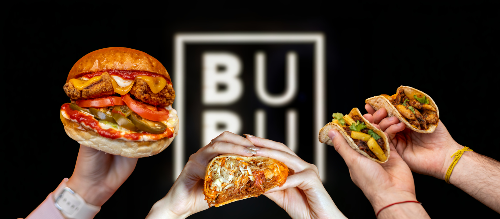Tripla Angus marhahúspogácsa (390g) , tripla cheddar, tripla bacon ,jégsaláta, csemege uborka, lilahagyma dzsem, BuBu burger szósz / Triple Angus beef patty /390g/, triple cheddar, triple bacon, iceberg lettuce, pickled cucumber, purple onion jam, BuBu burger sauce